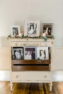 The vintage style chest (which is available on-site here at The Bradford!) was used to display family photographs of the generations of happily married couples--such a sweet and personal touch!