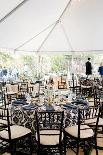 And we cannot forget to mention the super classy and chic design of guest tables! The beautifully patterned navy linens really added a unique style to the event and made for some eye-catching photos! & just look at how perfectly the chiavari chairs lent into the vintage look of the event...