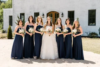 In terms of color scheme for this vintage wedding, we loved the navy blue bridesmaid dresses! The pops of ivory, blush, white, and silver within the floral arrangements and bridal bouquets brought even more subtle elements of color! And see for yourself just how perfectly the neutral grays from the grooms tuxedos blended with everything...